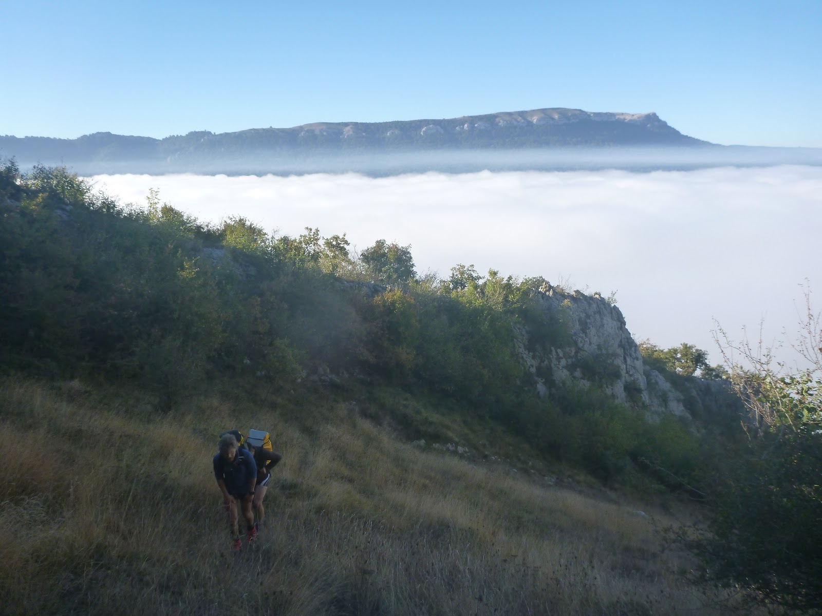 Comenzamos una fuerte y mantenida subida ente la niebla de la mañana, el sendero labrado que tiene cadenas a modo de pasamanos ... necesidad imperiosa que nunca hubo debido a la cercana proliferación de patosos de montaña ... aun dormidos en pensamientos dispares, llegamos al collado que da paso a la cara oculta de la luna, un gran hoyo a modo de cráter donde el bosque mágico se presenta en todo su esplendor, verdes y ocres, resbaladizas rampas aseguradas por metros y metros de cuerdas fijas que nunca existieron. Seguro que hay duendes, hoy al menos tres. La gigante pared extraploma escondida en su propia sombra.